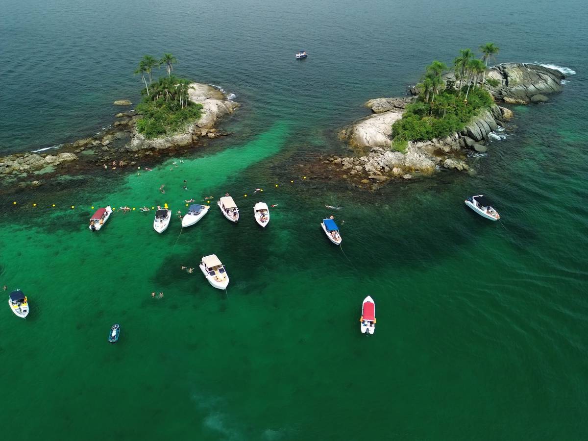 Passeio pelas ilhas de Angra com paradas em locais icônicos como a Ilha de Cataguases, as Ilhas Botinas e a Praia do Dentista.